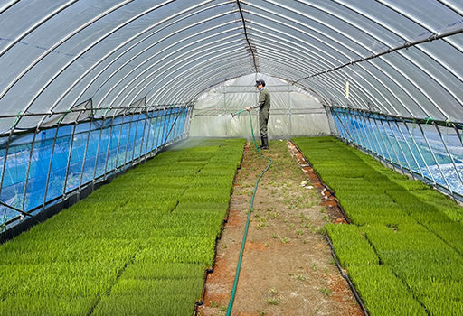 2~3日後、苗の赤ちゃんが白く柔らかな顔を出したら、ビニルハウスに移動します。ここから苗の成長は早く、1日で約1cmずつ伸び、色も鮮やかな緑へと変化を遂げます。若々しい緑色の苗が並ぶビニルハウスは圧巻です。