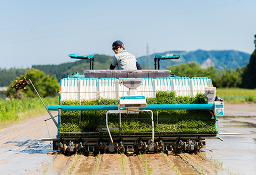 永平寺町内で自社栽培している田んぼは約100枚。山田錦15町歩、五百万石5町歩の合計20町歩です(1町歩=約10,000㎡)。しっかり根が張り背丈が12cm程に伸びた苗を田植え機にセットして、いざ出発です。