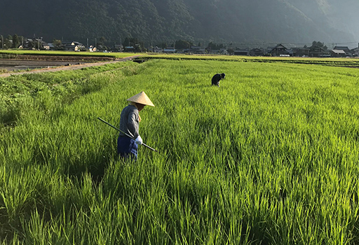 また、暑い日は、水口から水を入れ尻水戸を開放することで、なるべく水が冷たく保たれるように、また、嵐の日は水をたくさん入れ、水面を高くすることで苗が倒れるのを防ぐなどのコントロールもしています。そして、吉田酒造では「良い米は美しい田んぼから」を合言葉に各田んぼで月に1回は草刈りを実施しています。