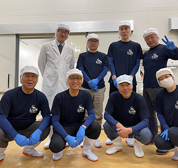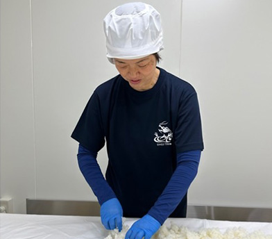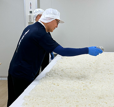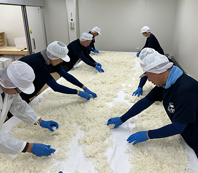 通常の蔵見学等ではまず経験することのできない『麹室』にも入室させていただき、自ら日本酒の要となる麹造りまでも体験させていただきました。蒸しあげた酒米に種麹を振りかける体験は、これぞリアル体験でしか味わえない大変貴重なもので、大感激です!